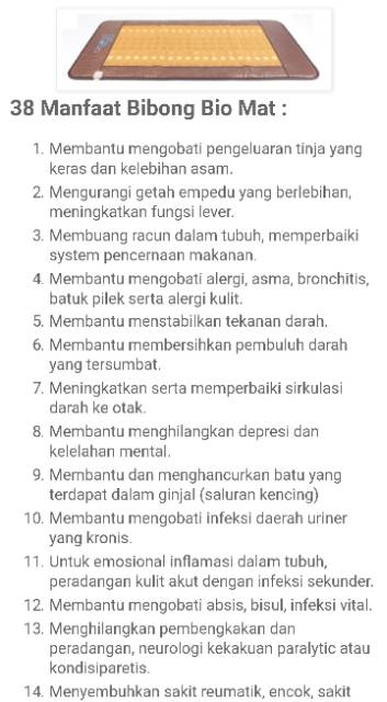 Bibong bio mat generasi 3 yang dijuluki si dokter jaga 24 jam yang pada tahun 2010 dinobatkan sebagai produk kesehatan paling inovatif ini memiliki berbagai manfaat digunakan untuk 7 tujuh terapi kesehatan sekaligus.